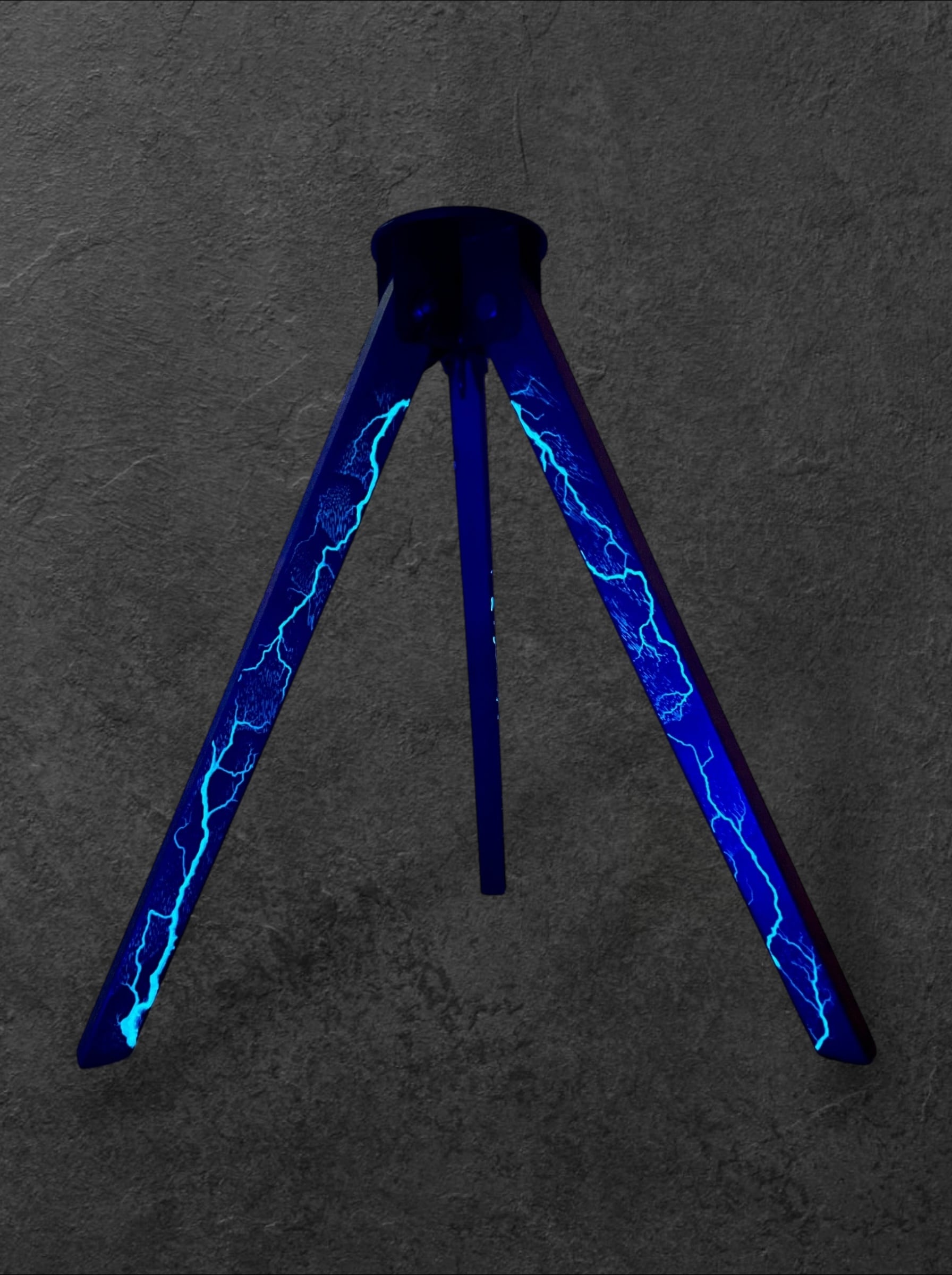 定番の木製三脚にウォールナットにkakera9様がリヒテンベルク図形を施した、特別な蓄光効果をもつ商品です。